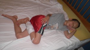 The next morning Andy was in the shower and I wanted to change the dressing on Jonah’s leg, so I told him to sit down on the chair in the living room. I started to unwrap the bandage when he attacked me, scratching at my face, hitting and kicking me. He smashed my glasses into my face, hard, then snatched them off and threw them across the room. I grabbed his arms, held tight to his flailing wrists, and called for Andy. Andy came running from the shower and together we managed to get him to our room and pin him on the bed – Jonah screaming, Andy yelling, me sobbing – the three of us re-enacting the climax of a bad Lifetime movie. After everything calmed down, we mostly kept him still and had more “quiet time” in the bed, each of us taking turns lying with Jonah while the other cleaned up or did laundry.