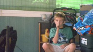 Here he is at the end of our driveway, preparing for the Flintstones-style foot walk-ride back down the driveway. I’ve ceased to be embarrassed by his many public eccentricities, so this didn’t really phase me; I figure we might even be entertainment for our normal neighbors. But when he parked the stroller back on the porch, tucked both feet up on its footrest, stuck his thumb in his mouth, and gazed squarely over at me, I had to laugh at the unspoken challenge: