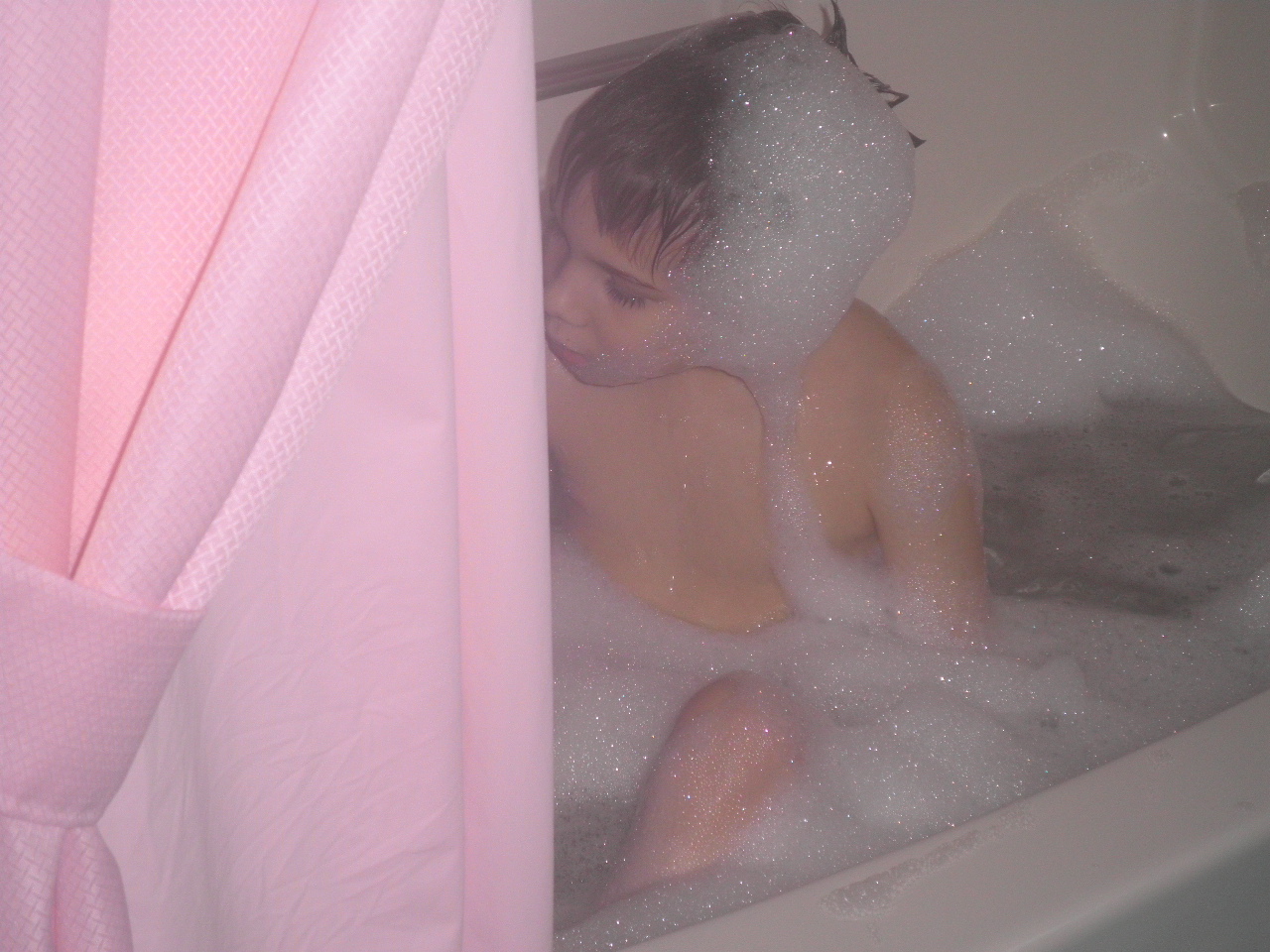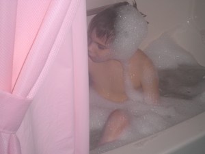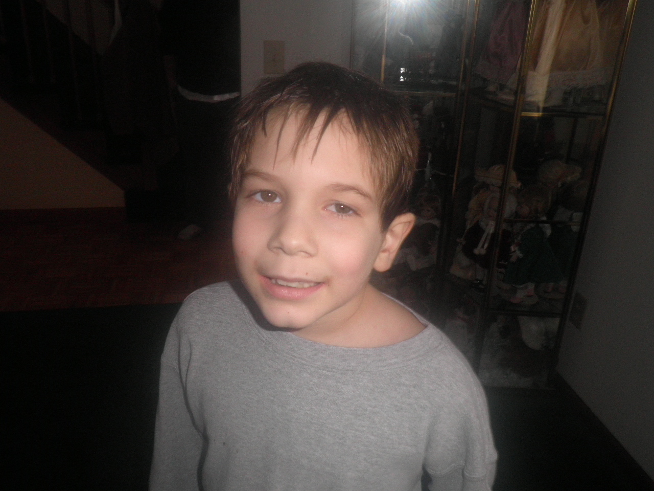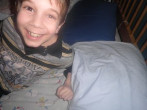When I got there around 5:15, Jonah was in his room on a time-out. He was glad I came, so when he’d served his time, we started playing in the bedroom, his recent choice for a fun place to play. He seemed fine, jumping on the bed and singing along when I invented songs, tickled him, and took his picture with the camera. I’d brought him some colored straws with sparkly strands hanging off them and he clutched them happily, waving them around.