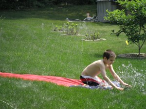 How were the visits yesterday and today with Jonah, M, and me? I think if you read my blog much, you know. It was difficult. Our options are limited. But we did go to grandma’s twice and he did have some good times too, like here on the slip-and-slide she’d laid out on the lawn…