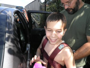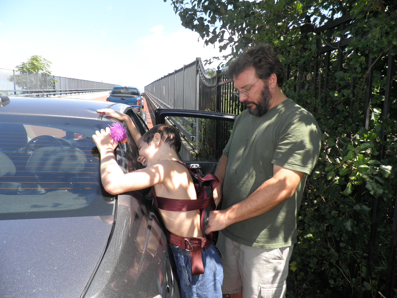 Andy, strapping Jonah into his car harness as Jonah laughs hysterically and clutches “purple octopus.”