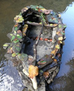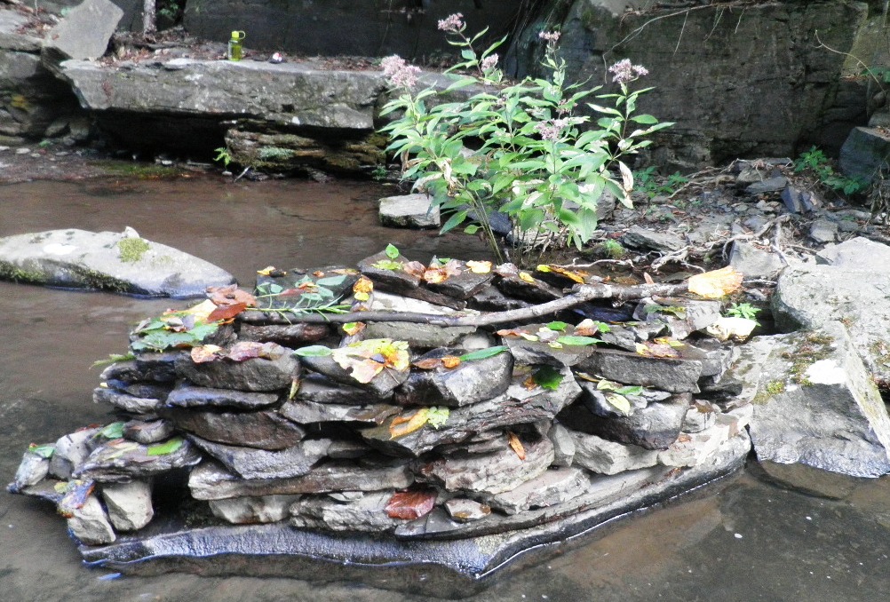 When I returned home from our visit, I drove up to the Rensselaerville Falls and made a large nature art creation.  Nobody was around.  Nobody almost ever is…even when the parking lot is full, most people are on the ridiculously steep trails.  I hefted rocks that I looked at after I was done, wondering how I’d lifted some of them at all — then, with my rock-circle-wall sufficiently constructed, I began decorating it, first with two branches to make a cross, then with fallen leaves I could find on the ground or trapped swirling around a stick in the water.