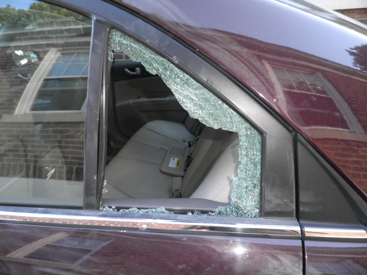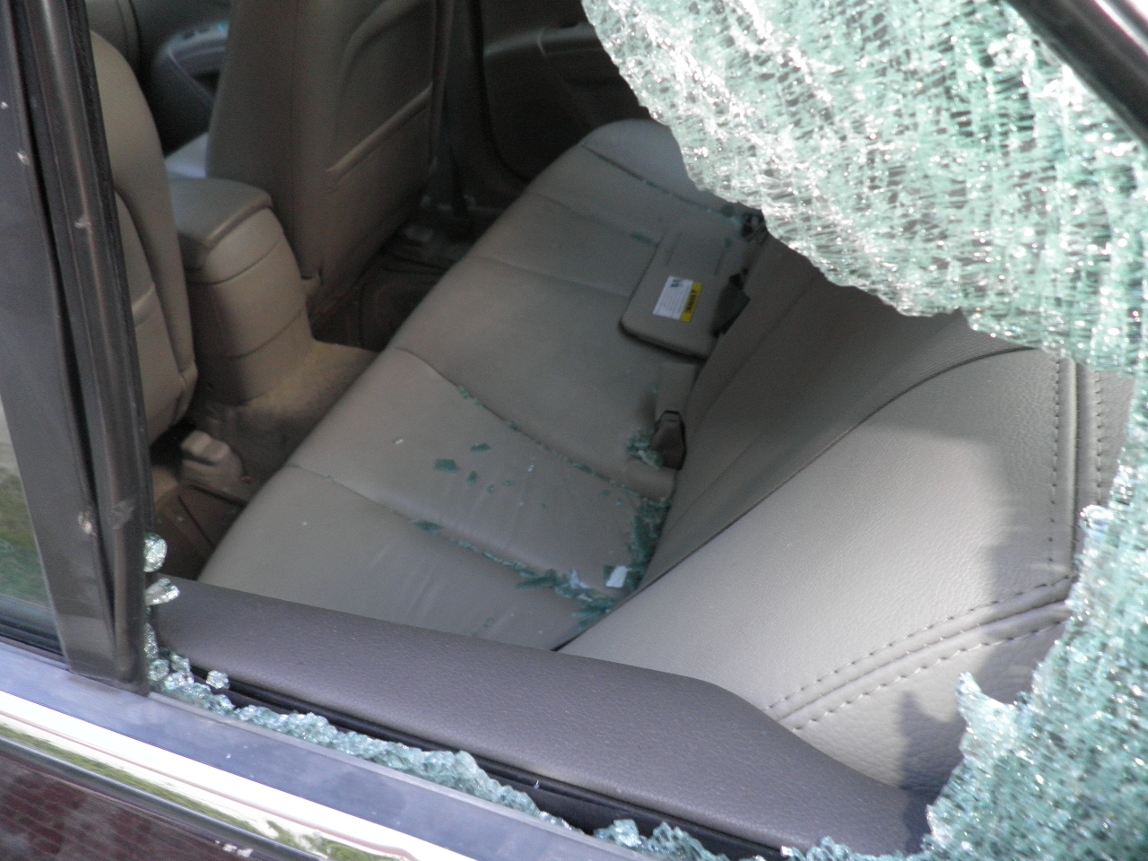 “Well I’ve never done this before,” he said before giving the window just a wee more than a tap with his giant sledgehammer.  The result was my anticipated, satisfying SMASH, glass all over the inside of my car.