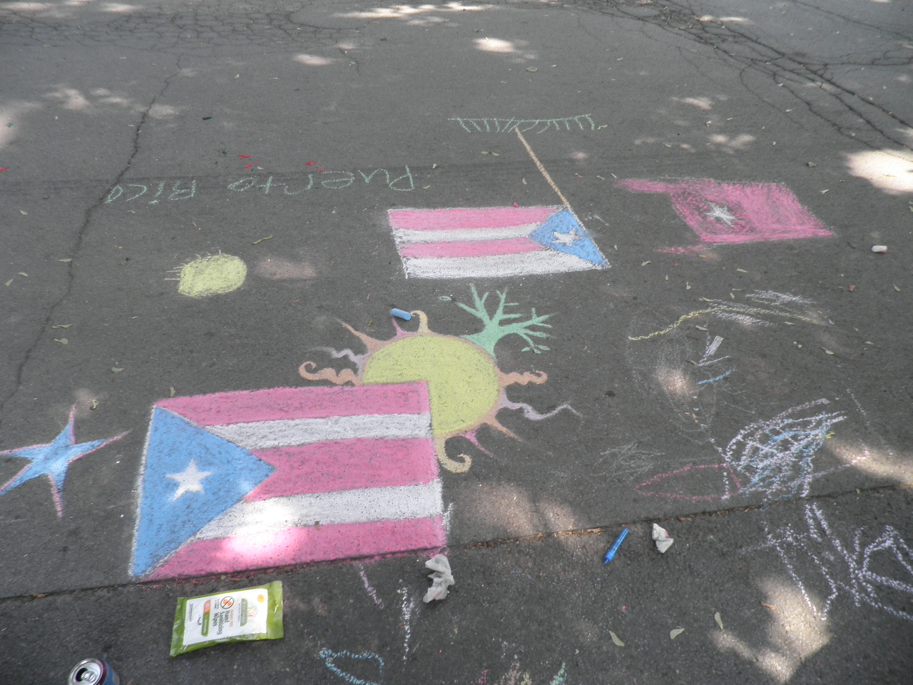 First I drew the Puerto Rican flag.  Most of the attendees seemed to be Puerto Rican; the vendors sold a lot of Puerto Rican flags and shirts, so I had plenty of opportunity to make sure I was getting it right with the stripes and colors.  Then I couldn’t leave well enough alone so I added a sun and a tree.  That’s when all the kids came, and the real fun began.