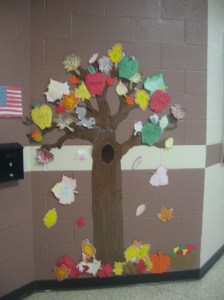 I did something very similar to my dorm room door, junior in college – only we glued real leaves to the wall…