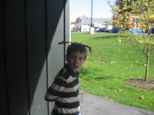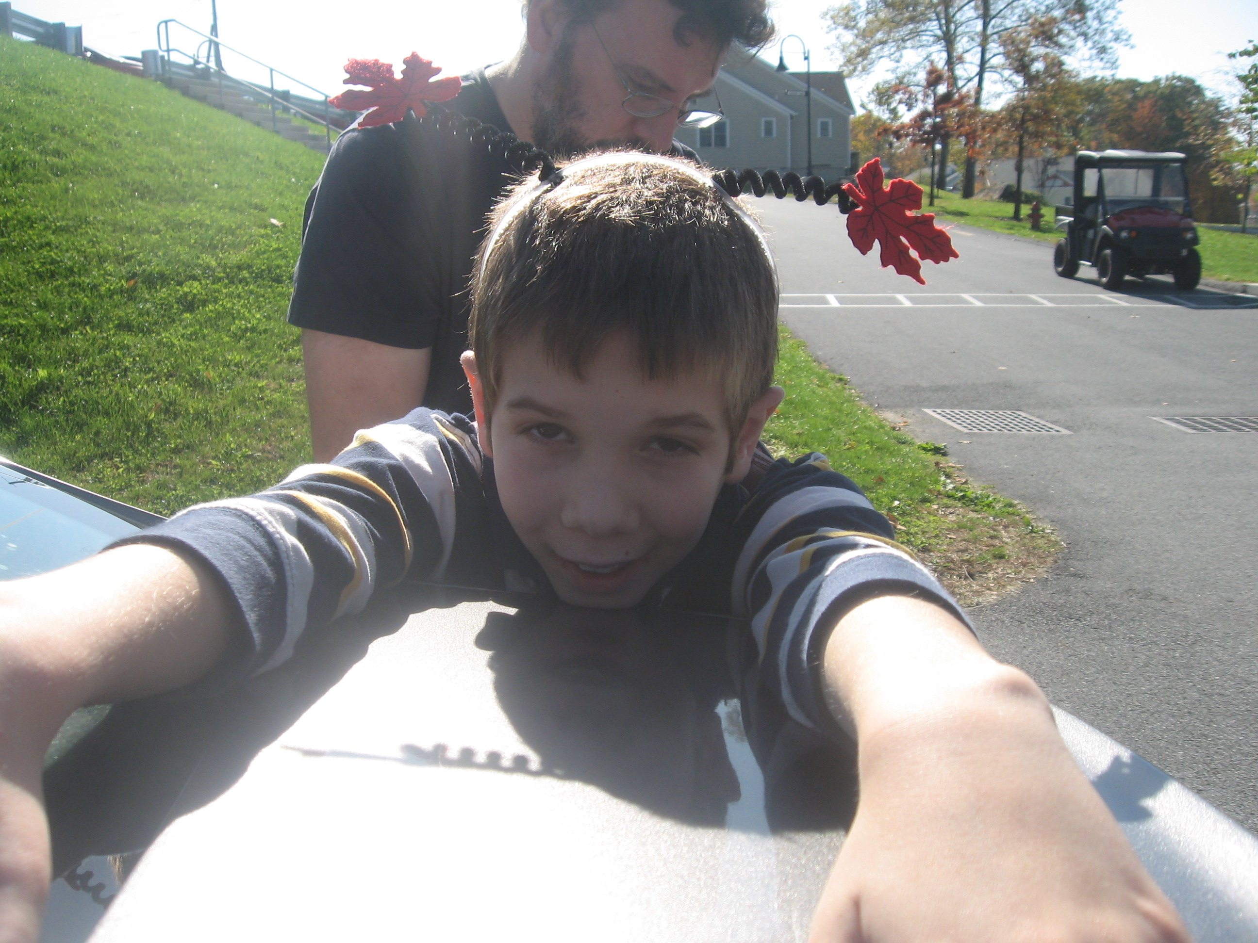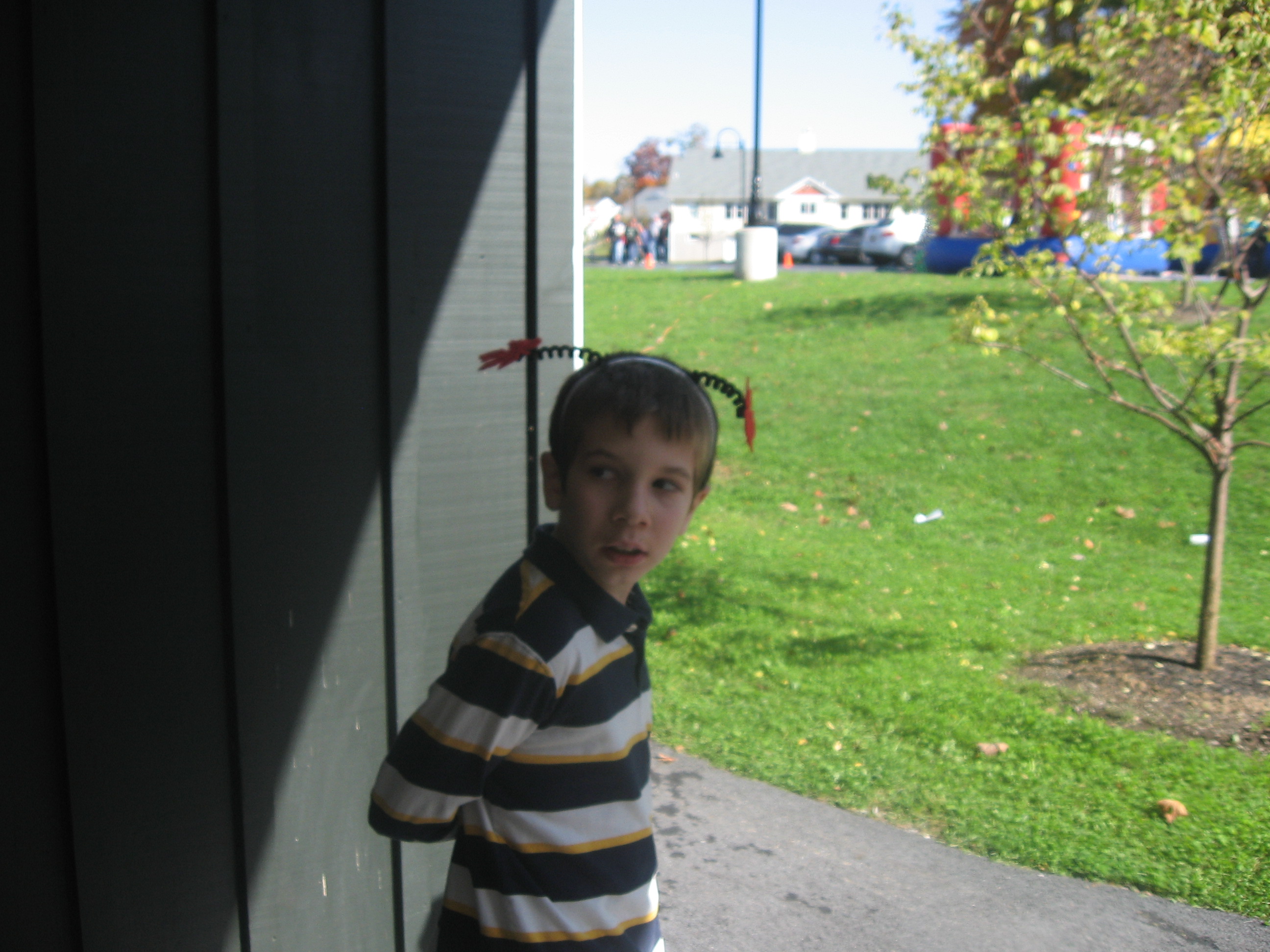 They’d actually managed to get him to wear this headband with two curled black pipe cleaners and red leaves on the end of each one. He used to hate stuff on his head — hats, hoods, Halloween costume accessories. When or why or how this changed, I have no idea. In some ways Jonah is very malleable; he morphs almost magically into a different kid, one little corner of his brain making seemingly arbitrary decisions in matters of head coverings and food preferences, who he requests to be with him in the backseat, what he wants to drink: appoo ci-der? milk? cranbewwy soda?