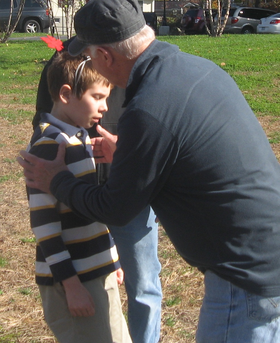 What a beautiful day, too, sunny and warm and autumn-pretty – after visiting the school, we walked to Jonah’s house and then to the recreation center, where they had bouncy bounces set up, grills cooking up yummy food, and activities for the kids. We waded through the groups of kids and teachers until we found Boo.