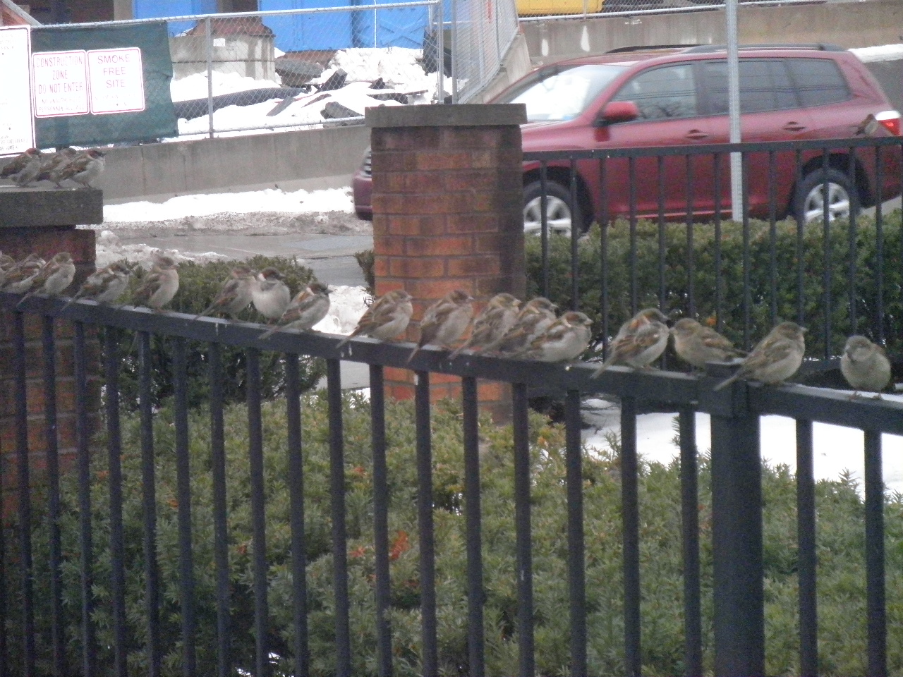 Here are birds sitting on the iron fence outside Albany Medical Center at 8am this morning, undisturbed by my close proximity.
