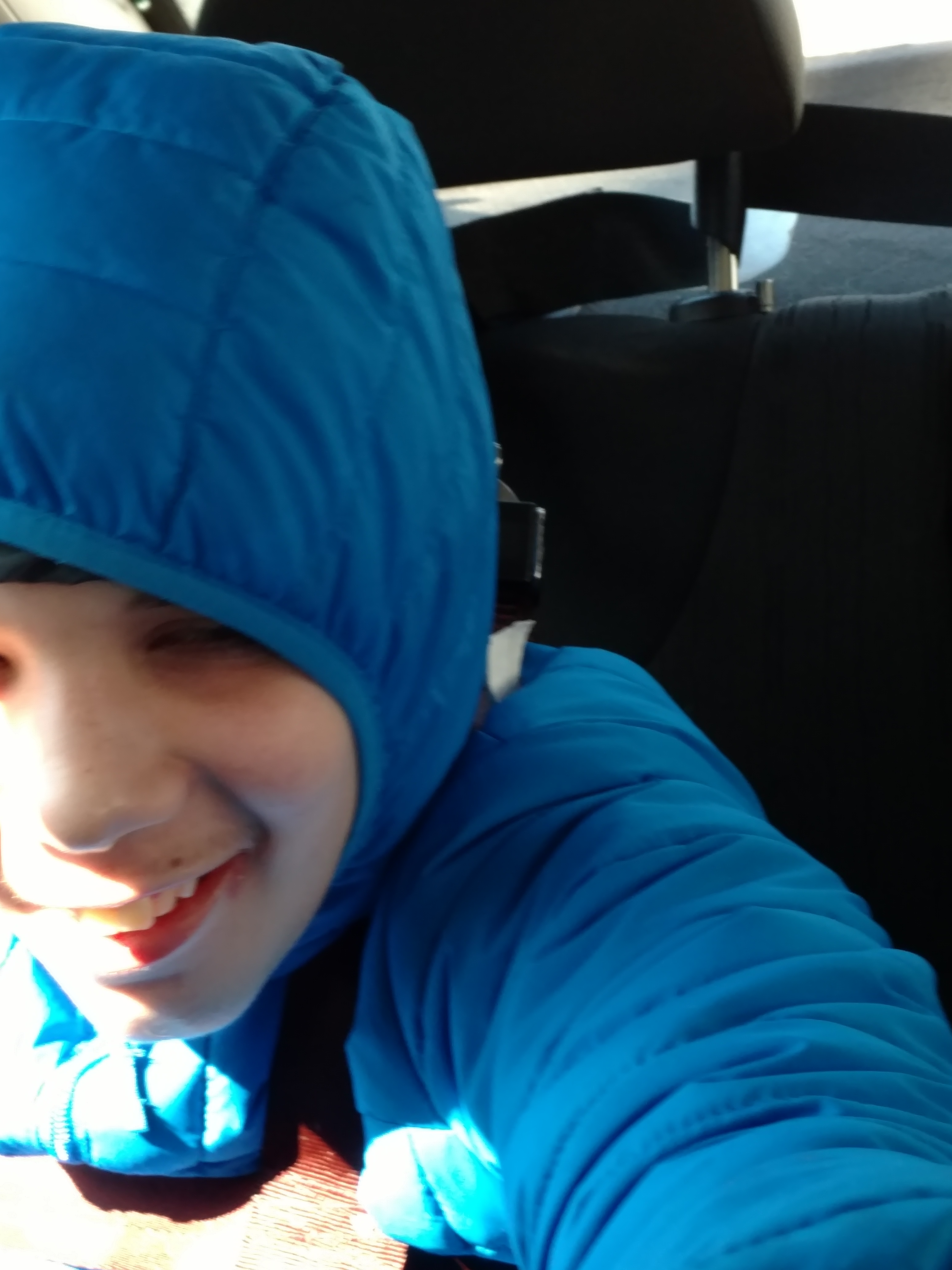 And so the child who once wouldn’t wear a hat or a hood or a cap, no matter what the circumstance, is now the teenager who wears his hood up and tied securely around his face.  I have several photos of him, several weeks in a row, sitting in the back on car ride (he hasn’t been coming in to Andy’s apartment for his visits lately).  In each photo he’s got the blue coat on with its hood up.  Last Sunday while parked in Andy’s driveway, Jonah declared blue shirt on?  – so Andy went inside and changed into one of many blue shirts he keeps in a special place for just such a request.  Thus appropriately garbed, he got back in the car and prepared for another ride.