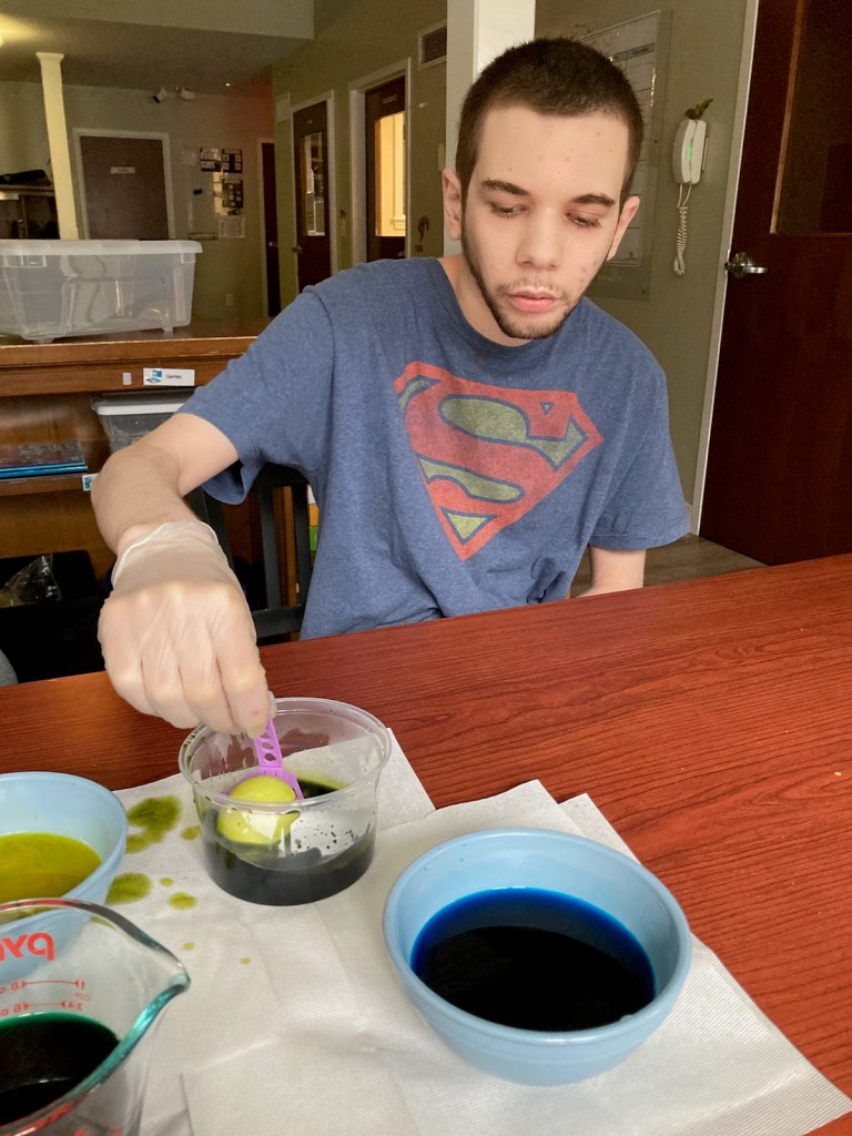 Can I believe my son is 20? Nope. I like him with the beard and ‘stache, though I reckon he’s just as handsome clean-shaven. Two pics are Jonah with his Easter Basket from Krause’s Handmade Candy, and a very focused Boo dyeing eggs. The 3rd photo is Boo on March 7th, his 20th birthday, about to blow out his (chocolate) cake (with chocolate frosting). HIs house threw him a big party, complete with pizza and wings – and all the blue cheese he wanted.