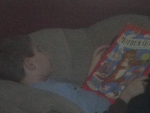Jonah attacked once so far today when he was with Andy, in my car. That safety harness I bought has proven worth its weight in gold. Now Andy’s off to his new job and Jonah’s napping on the big chair in our family room with a Mother Goose book clutched in his hands; I’m stealing a minute here before we go to my mom’s for spaghetti dinner.