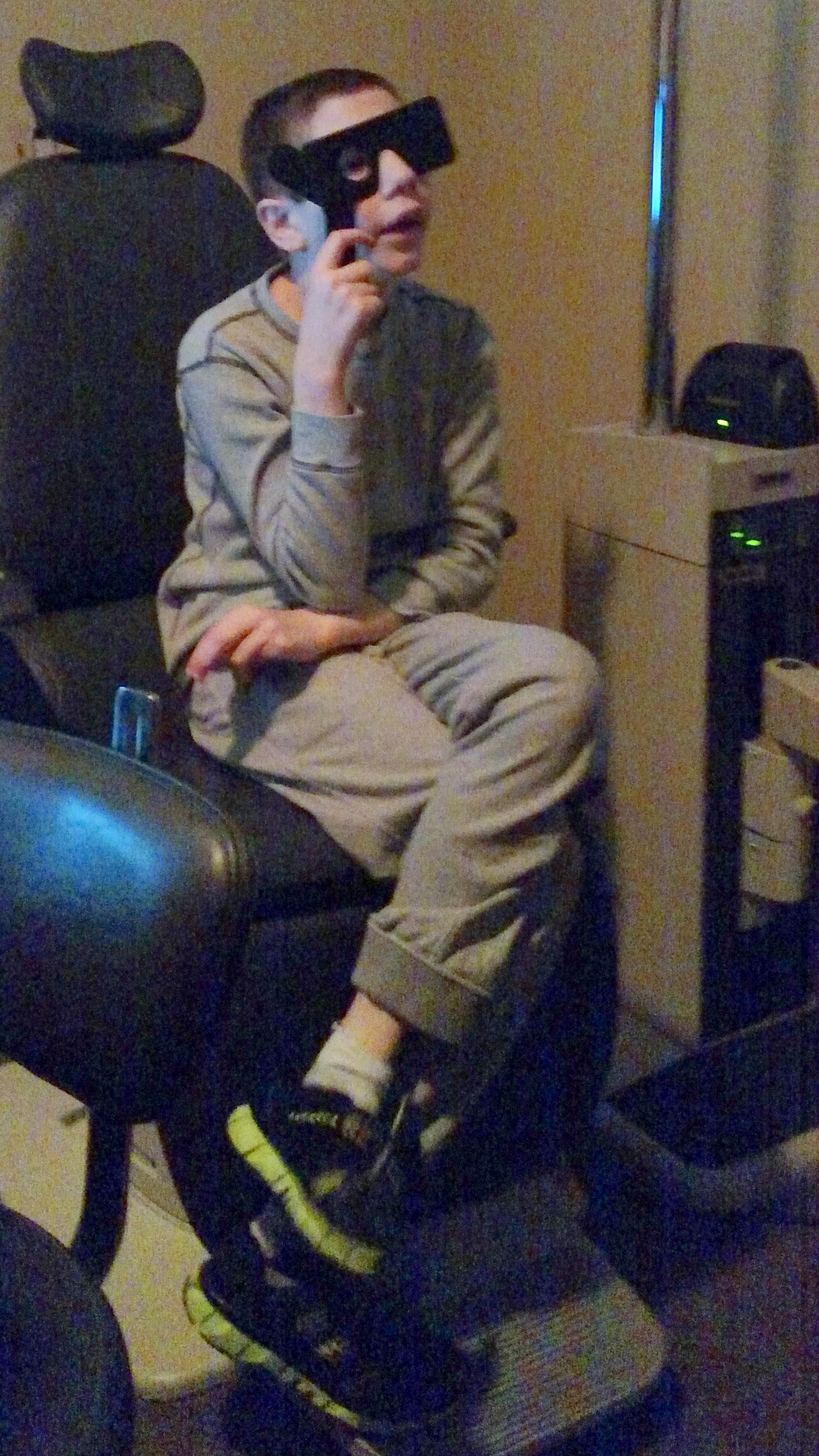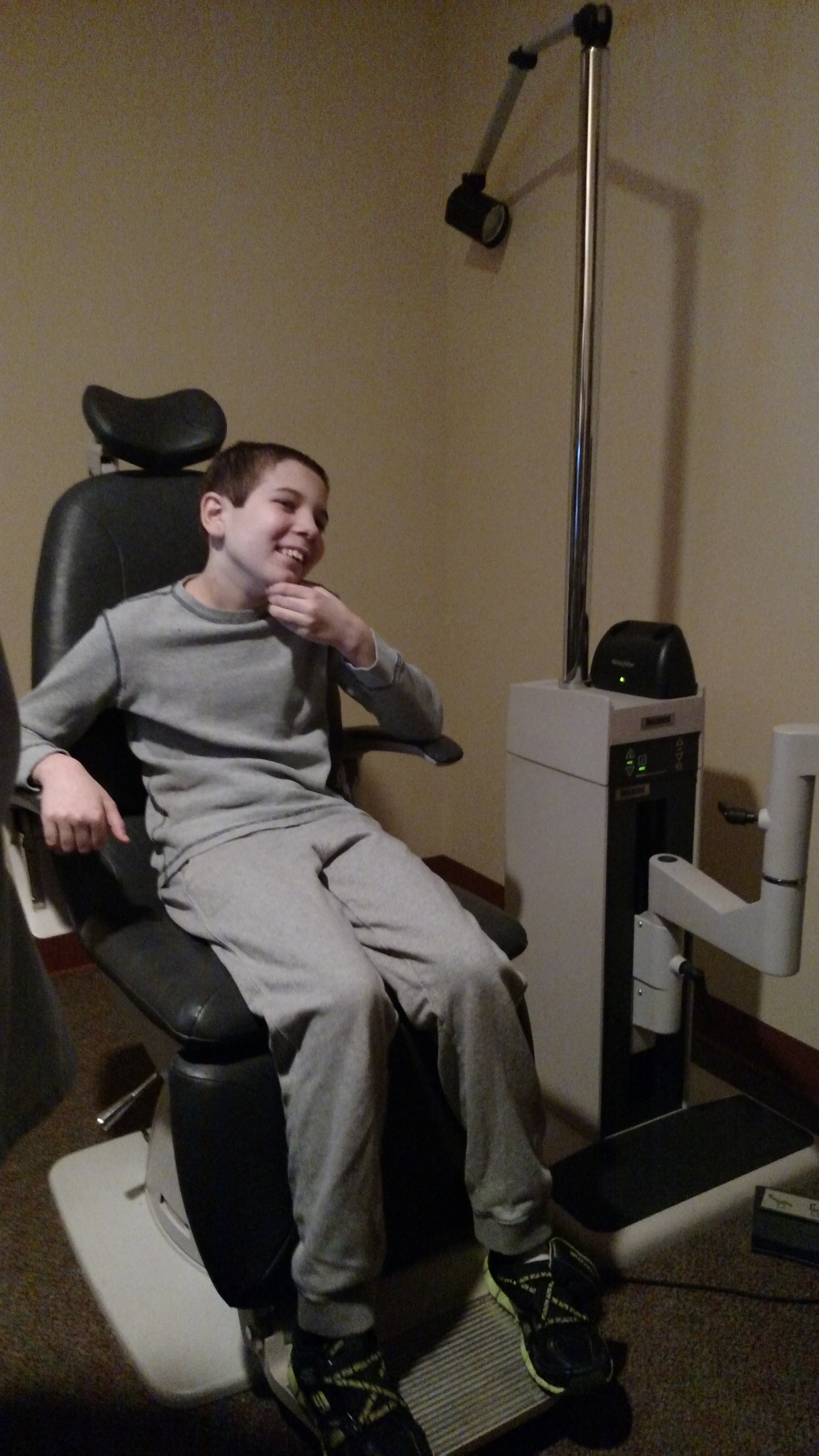 Jonah at the eye doctor, January 2015. He’s knows the routine and is better behaved there than most adults. His eyes look good!
