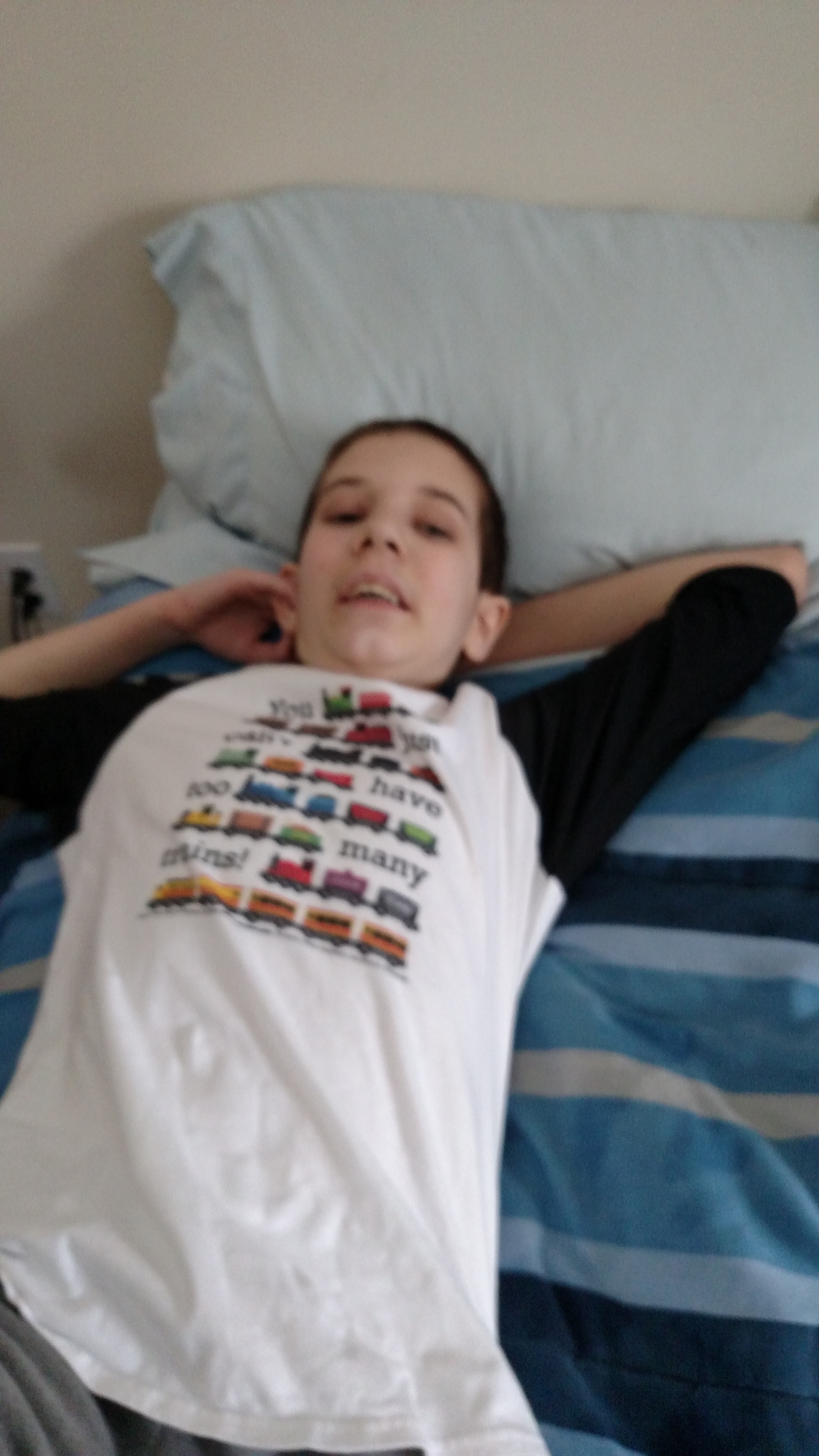 Jonah in daddy’s “big blue bed,” sporting the You Can Never Have Too Many Trains t-shit his “aunt KP” bought him for Christmas.