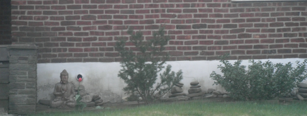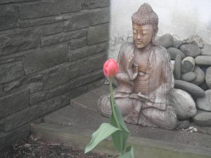 Along the whole length of the front of our house, only one soft-red tulip stood loyally beside the Buddha.