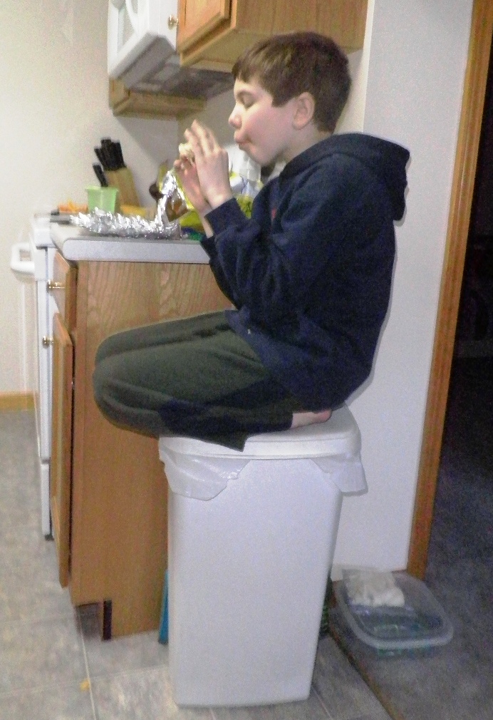 His perch while eating is atop a white garbage container which sits next to Andy’s kitchen counter. It is Jonah’s dry bar – and the garbage can, his bar stool. He tucks his legs under him, mama-style, and chows down to his content. Good thing Andy is very clean, but then again, no reason to be a germaphobe when your kid takes 5 baths a day.