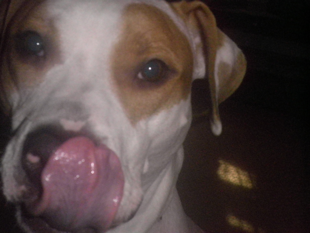 who is a big 90-pound 2-year old galoot of a mutt-pup and evidently wishes to lick humans to death.